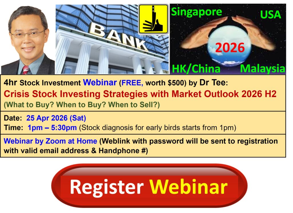 Zoom will be started 30 min before event, bonus talk (Q&A on any investment topics from readers) for early birds. There are many topics we will cover in this 4hr webinar, Dr Tee can have more time for Q&A if you could stay later after the webinar, you could ask on any global and local stocks including but not limited to 30 STI component stocks: